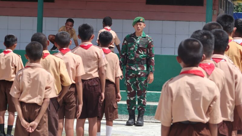 Jurnalpapuanews.com || Nabire, Papua Tengah – Dalam upaya membentuk generasi muda yang disiplin, berkarakter, dan memiliki jiwa nasionalisme, prajurit Yonif TP 804/DBAY secara rutin melaksanakan pembinaan dan pelatihan ekstrakurikuler Pramuka di SD Pengharapan, Kabupaten Nabire, setiap hari Jumat. (27/02/2026).