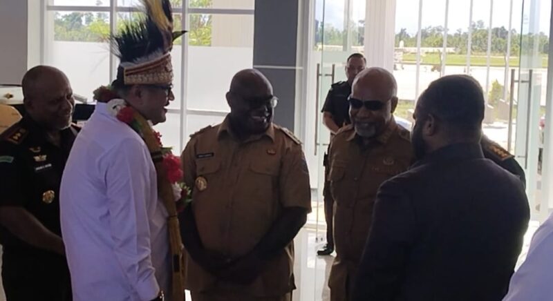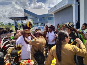 Setibanya di Bandara Douw Aturure, Nabire, Kajati Papua disambut langsung oleh Penjabat Gubernur Papua Tengah, Meki F. Nawipa, S.H., bersama Wakil Gubernur Deinas Geley. Prosesi penyambutan berlangsung khidmat dengan balutan adat lokal, mulai dari tarian tradisonal hingga pengalungan bunga sebagai simbol penghormatan tertinggi bagi tamu daerah.