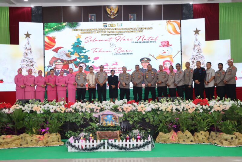 Jurnalpapuanews.com || NABIRE – Dalam upaya memperkokoh iman serta semangat pengabdian personel, Kepolisian Daerah (Polda) Papua Tengah bersama Polres Nabire menyelenggarakan perayaan Natal Oikumene Tahun 2025. Acara yang berlangsung khidmat tersebut dipusatkan di Aula Wicaksana Laghawa, Polres Nabire, pada Jumat (16/1/2026).