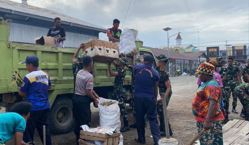 Jurnalpapuanews.com || Nabire, Papua Tengah – Dalam semangat gotong royong dan kepedulian terhadap kebersihan lingkungan, Yonif TP 804/DBAY turut ambil bagian dalam kegiatan Karya Bhakti yang dilaksanakan di kawasan Pasar Oyehe, Taman Gizi, dan Terminal Oyehe, Kabupaten Nabire, Jumat (27/2/2026).